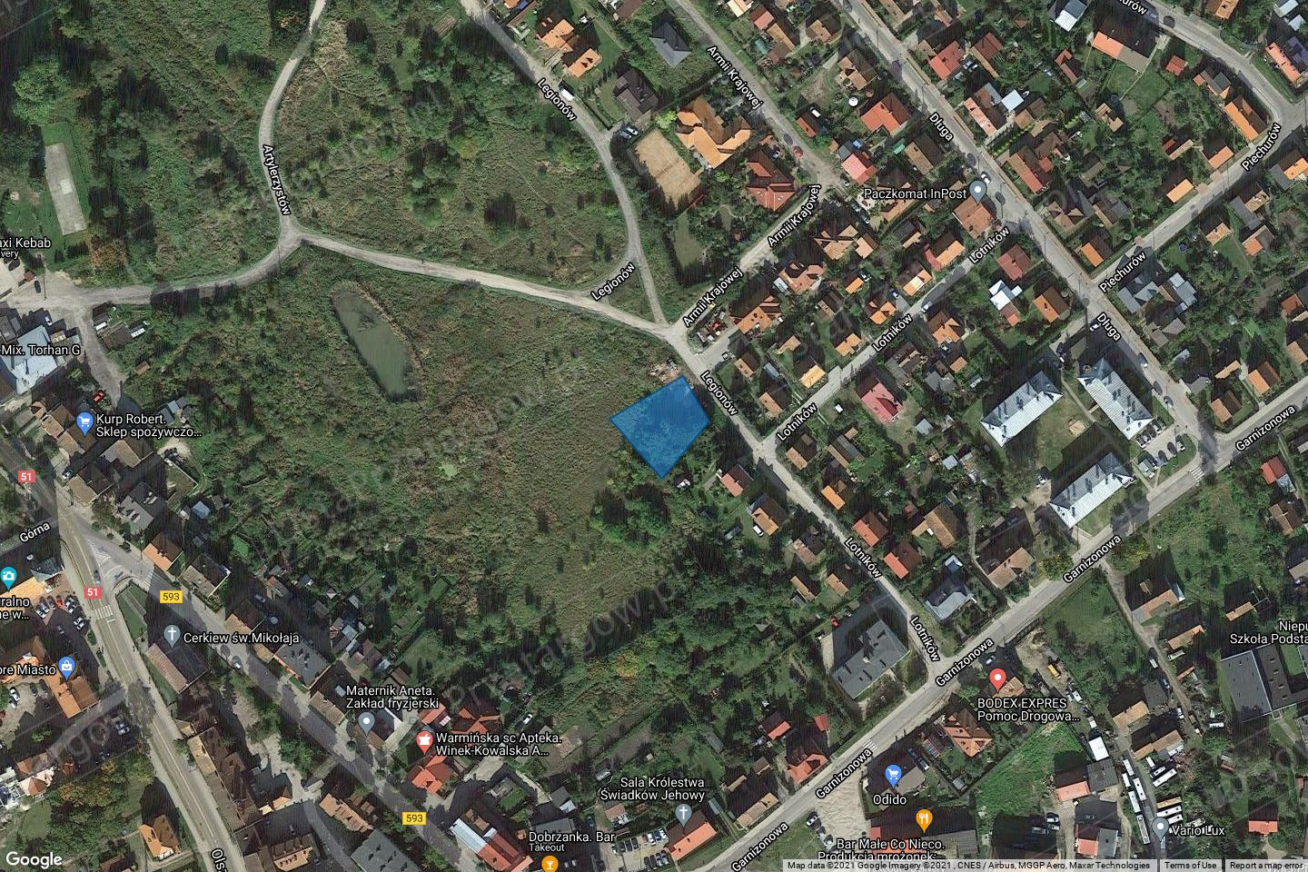 > Lokalizacja Działki oznaczone nr 820, 821, 822, 829 i 830 położone są w kompleksie niezabudowanych działek przeznaczonych pod budownictwo mieszkaniowe jednorodzinne, w sąsiedztwie istniejącej zabudowy jednorodzinnej. Do centrum miasta około 300 m. Dojazd do osiedla odbywa się ulicą Garnizonową. Do centrum miasta można dojść nieurządzoną drogą - ul. Artylerzystów. Za nieruchomością znajduje się teren zielony ze zlewnią opisaną w MPZP jako WS.06. Teren położony w obniżeniu w stosunku do terenów otaczających.