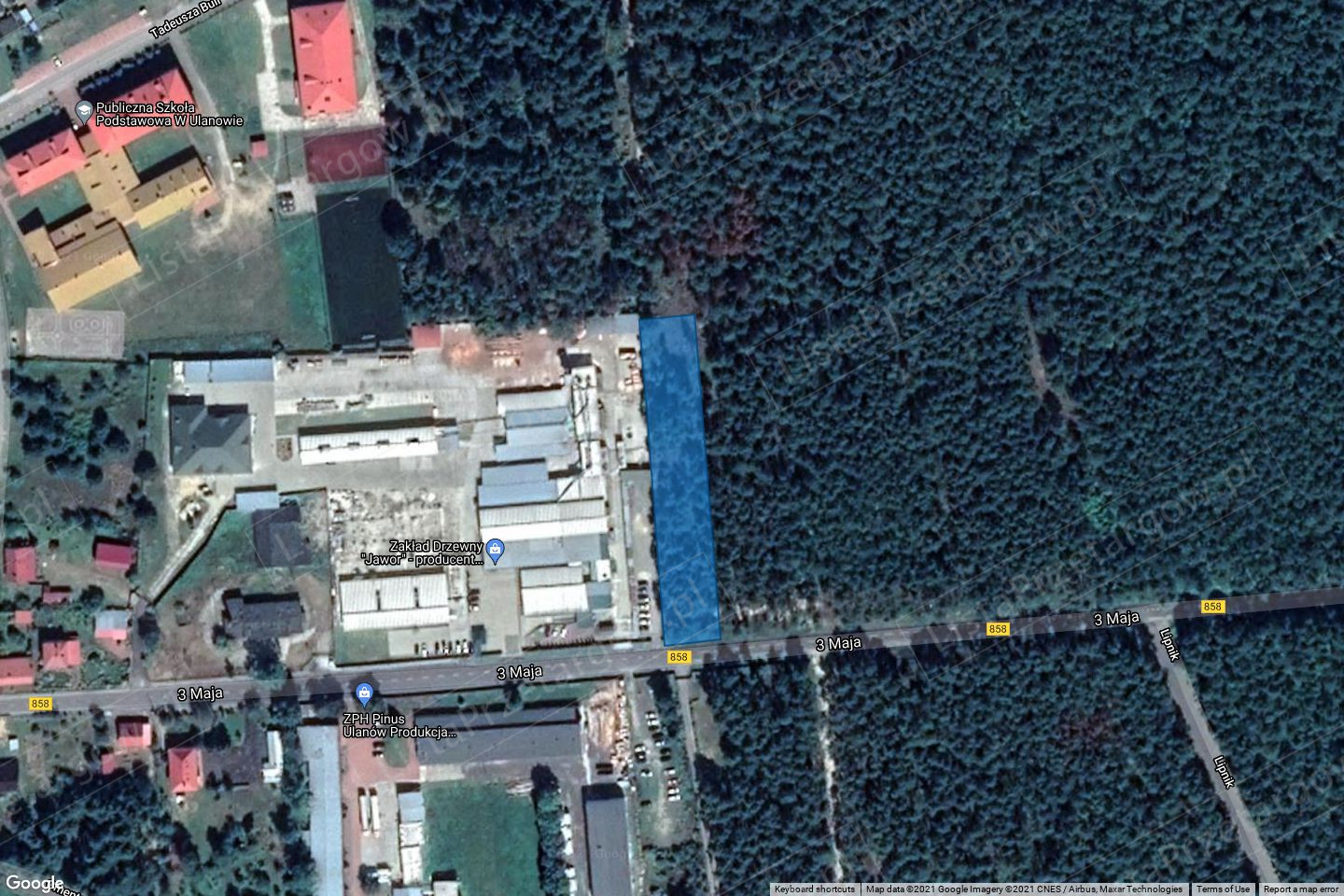 Przedmiotem przetargu jest nieruchomość gruntowa niezabudowana o nr ew. 633/12 o pow. 3004 m² położona w Ulanowie przy ul. 3 Maja. Działkę stanowi grunt leśny bez możliwości uzyskania zmiany sposobu użytkowania terenu, ponieważ zapis o przeznaczeniu działki w Miejscowym Planie Zagospodarowania Przestrzennego, który przestał obowiązywać nie zakładał zmiany sposobu użytkowania gruntu. Dojazd do działki bezpośrednio z drogi wojewódzkiej asfaltowej. Grunt płaski, suchy, porośnięty w 50 % drzewostanem sosny w wieku 100 lat. Kształt regularny prostokątny. Sąsiedztwo działki z jednej strony stanowi zabudowa przemysłowa, z pozostałych stron tereny leśne z drzewostanem.