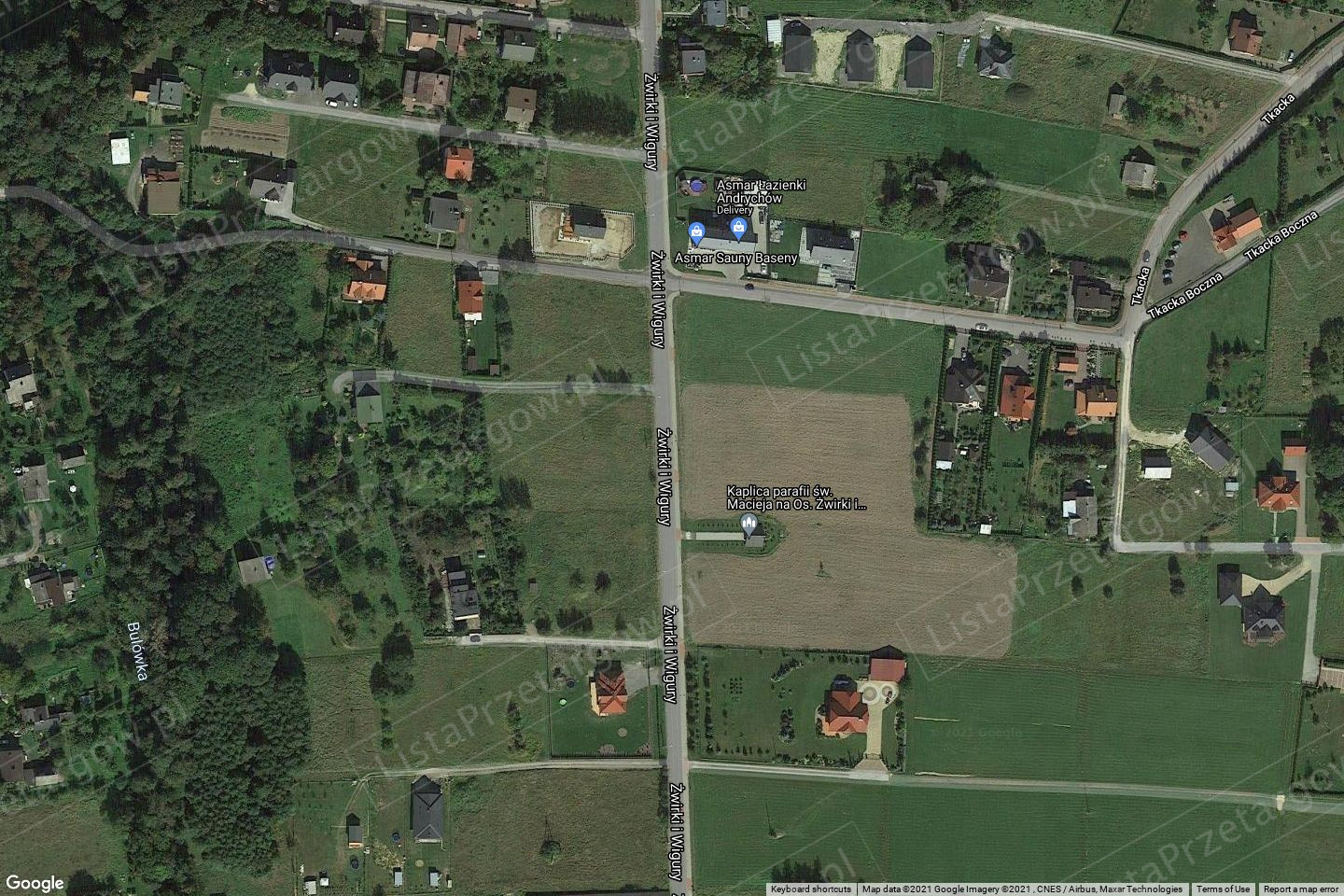 Zbywane działki są niezabudowane, położone w odległości ok. 1200 m od centrum miasta. Najbliższe otoczenie stanowią grunty niezabudowane – łąki, zabudowa mieszkaniowa jednorodzinna, grunty zabudowane usługowo oraz kaplica. Działki tworzą jeden kompleks gruntów, nieogrodzony o kształcie regularnym – szerokość kompleksu wynosi od 9 m w części zachodniej (dojazd) do ok. 19-22 m w pozostałej części. Nieruchomość przylega do drogi asfaltowej (Żwirki i Wigury) – droga powiatowa. Dojazd do nieruchomości odbywa się po działce nr 1423/22, częściowo przez chodnik o nawierzchni z kostki brukowej. Pas drogowy (jezdnia i chodnik) nie znajdują się na terenie kompleksu. Teren jest płaski, porośnięty trawą. Sieć wodociągowa, kanalizacyjna oraz energetyczna biegnie w odległości do kilkunastu metrów od granicy kompleksu (w pasie drogowym ulicy Żwirki i Wigury), zaś sieć gazowa w odległości ok. 40 m (w pasie drogowym ul. Tkackiej).