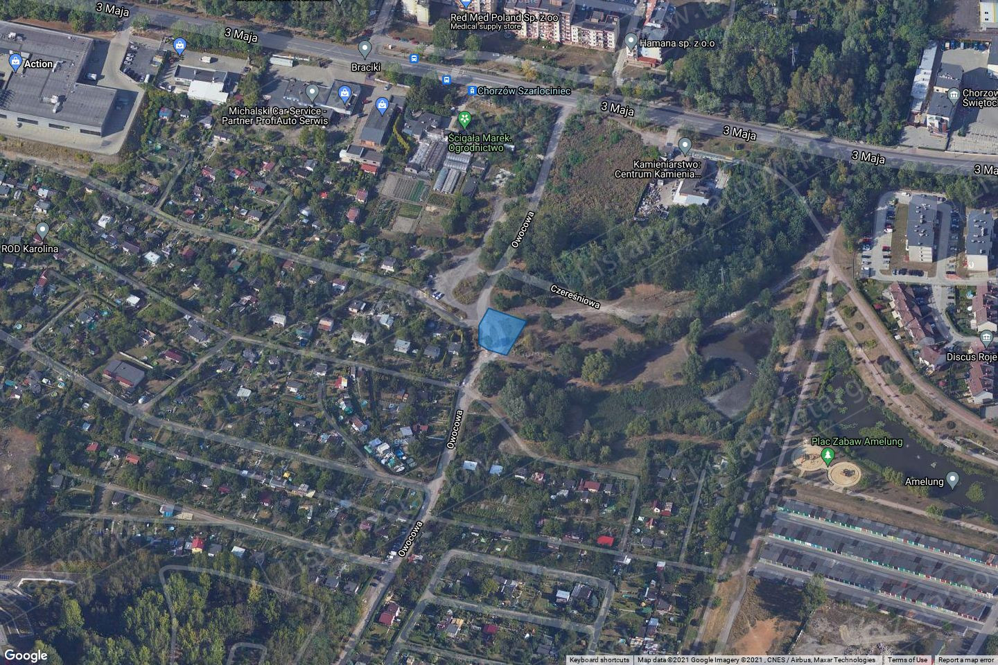 Działki znajdują się w zachodniej części miasta Chorzów w otoczeniu nowopowstającej zabudowy mieszkaniowej jedno i wielorodzinnej. Tereny ciche i spokojne. W bliskim sąsiedztwie Parku Amelung i Parku Miejskiego „Skałka”. Działka 31/47 porośnięta roślinnością. Przez działkę przebiega sieć kanalizacyjna i wodociągowa.