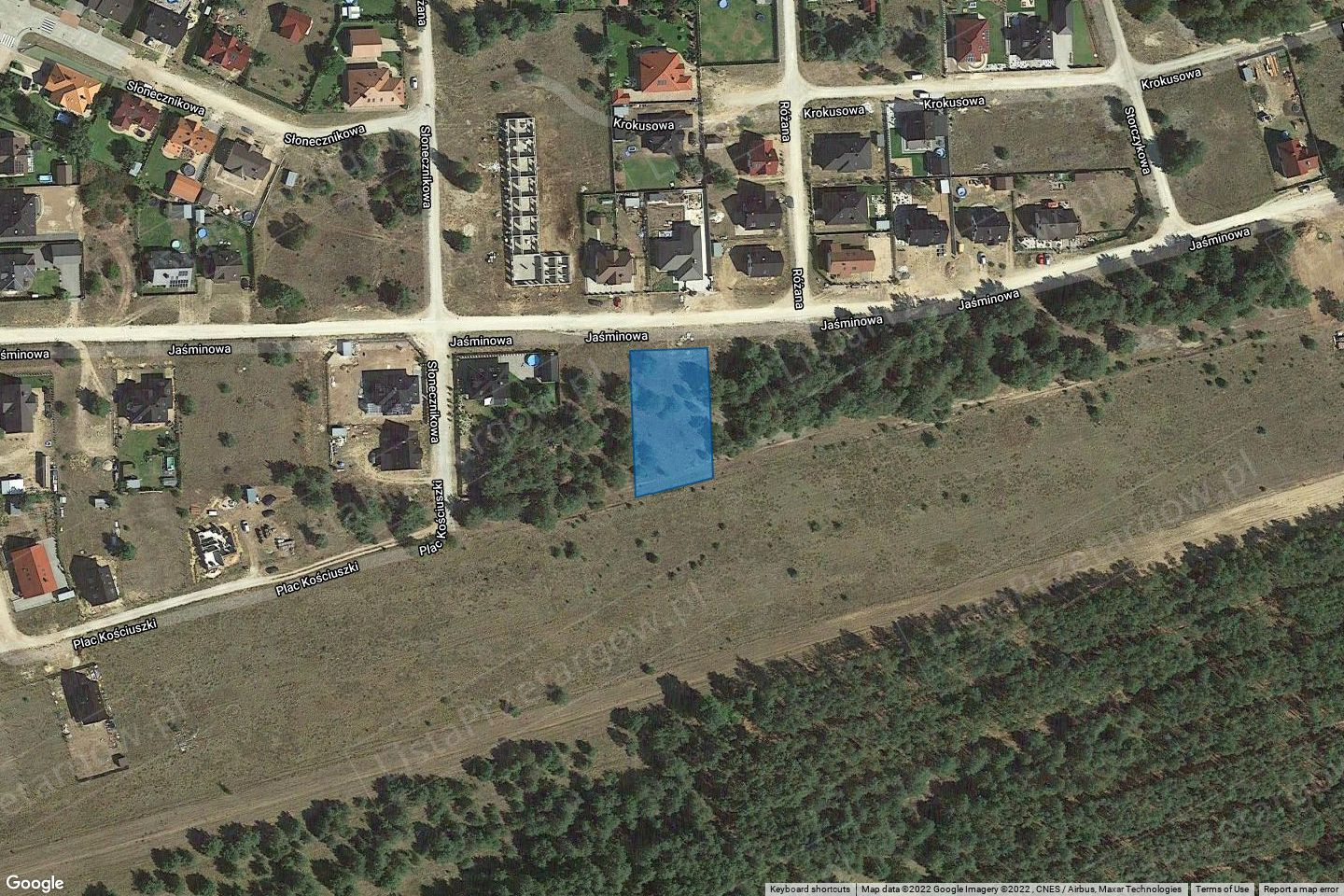 Przedmiotowa nieruchomość stanowiąca działki o numerach ewid. 1560 o pow. 0,1604 ha i 1686 o pow. 0,0854 ha są niezabudowane. Kształt działek regularny., brak utrudnień w swobodnym zagospodarowaniu. Obszar nieruchomości niezagospodarowany. Teren działek płaski. Nieruchomość porośnięta roślinnością trawiastą oraz pojedynczymi drzewami (samosiew sosny) nieprzedstawiającymi wartości użytkowej. Działki nieogrodzone. Dojazd do nieruchomości drogą gruntową.