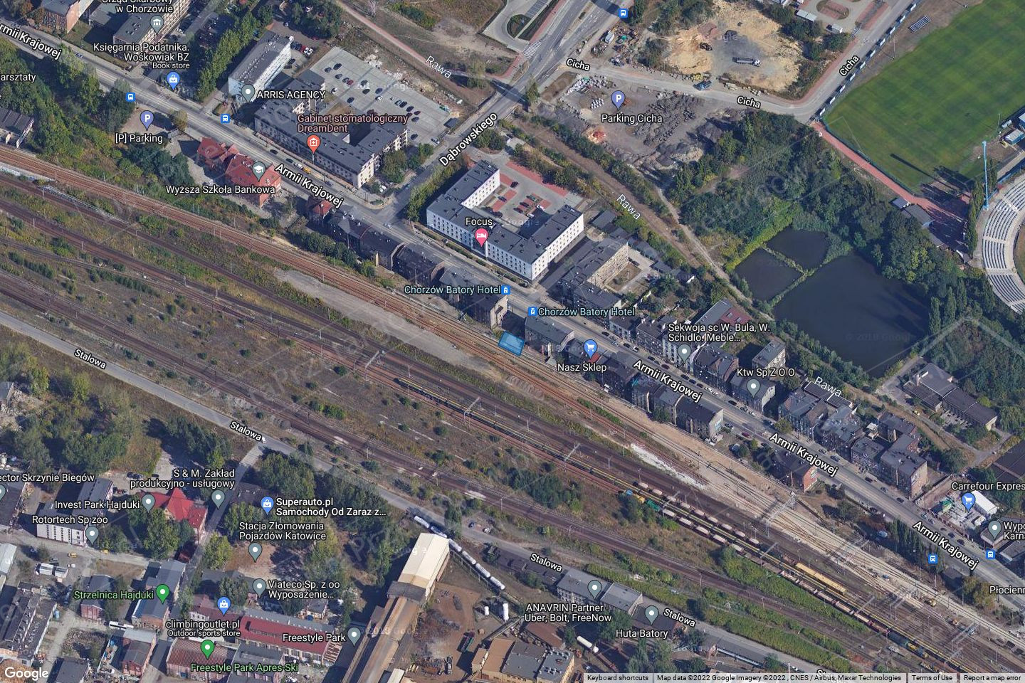 Działka znajduje się południowo – zachodniej części miasta Chorzów w otoczeniu zabudowy mieszkaniowej wielorodzinnej oraz terenów kolei. W niedalekiej odległości znajdują się tereny mieszkaniowo – usługowe. Działka posiada dostęp do drogi publicznej, ul. Armii Krajowej. Działka gruntowa, niezabudowana, użytkowana jako miejsca postojowe. Teren działki częściowo ogrodzony. Teren prosty. Przez działkę przebiega sieć energetyczna i kanalizacyjna.