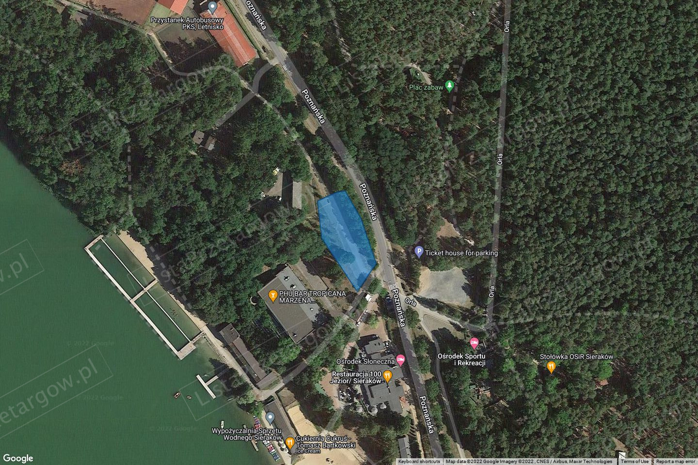 Nieruchomość gruntowa będąca własnością Skarbu Państwa w użytkowaniu wieczystym Gminy Sieraków położona jest w Sierakowie w sąsiedztwie Jeziora Jaroszewskiego, na którą składają się trzy zabudowane działki gruntowe oznaczone numerami 2010/5 o powierzchni 0,1844 ha, 2010/6 o powierzchni 1,6422 ha i 2010/8 o powierzchni 0,1416 ha. Łączna powierzchnia nieruchomości wynosi 1,9682 ha.