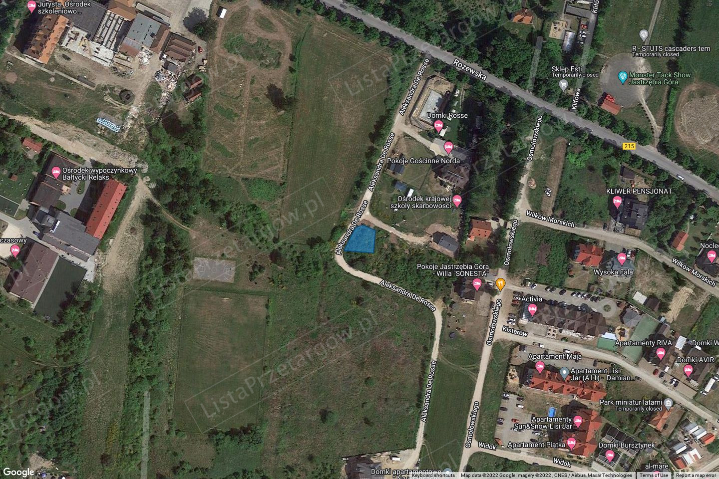 Nieruchomość niezagospodarowana, niezabudowana położona w Jastrzębiej Górze przy ul. Aleksandra de Rosse. Posiada bezpośredni dostęp do drogi publicznej. Infrastruktura w postaci sieci kanalizacyjnej, wodociągowej oraz elektroenergetycznej zlokalizowana w drodze – ul. Aleksandra de Rosse. Dział III i IV księgi wieczystej wolny od wpisów.