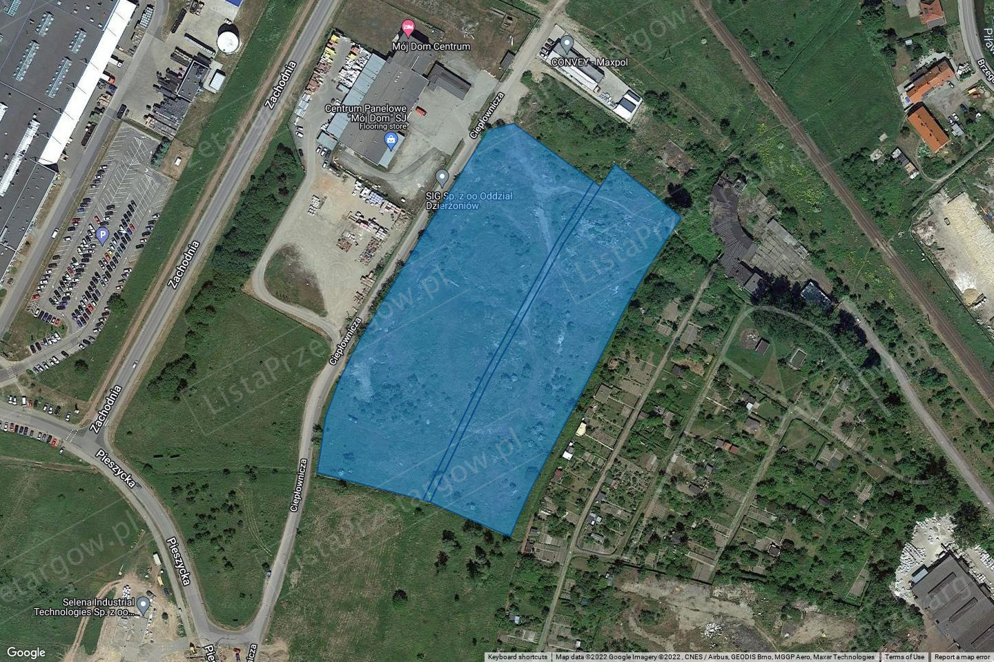 Nieruchomość gruntowa niezabudowana o pow. całkowitej 2.4360 ha, położona jest w zachodniej części miasta przy ulicy Ciepłowniczej w Dzierżoniowie. W jej skład wchodzą trzy działki oznaczone: nr 157 o pow. 1.3911 ha, nr 158 o pow. 0.0784 ha, nr 159 o pow. 0.9665 ha obręb Zachód w Dzierżoniowie, dla których Sąd Rejonowy w Dzierżoniowie Wydział VI Ksiąg Wieczystych prowadzi księgę Nr XXXX/XXXXXXXX/X. Teren nieruchomości niezagospodarowany, nieogrodzony, porośnięty samosiejkami drzew i krzewów. Działki nr 157 i nr 159 w kształcie regularnych prostokątów, które rozdziela na ich długości działka nr 158. Teren wykorzystywany do składowania materiałów drogowych i rozbiórkowych (ziemia, betonowy i ceglany gruz, zerwany asfalt drogowy, itp). Na części nieruchomości usytuowana jest instalacja wodociągowa, kanalizacyjna, burzowa, energetyczna, gazowa co utrudnia możliwość jej zagospodarowania. Dojazd do nieruchomości odbywa się drogą asfaltową ul. Pieszycką dalej ul. Ciepłowniczą. Docelowo planowane jest ustanowienie służebności przesyłu na działce nr 157 związanej z ułożeniem oraz późniejszą konserwacją sieci wodociągowej.