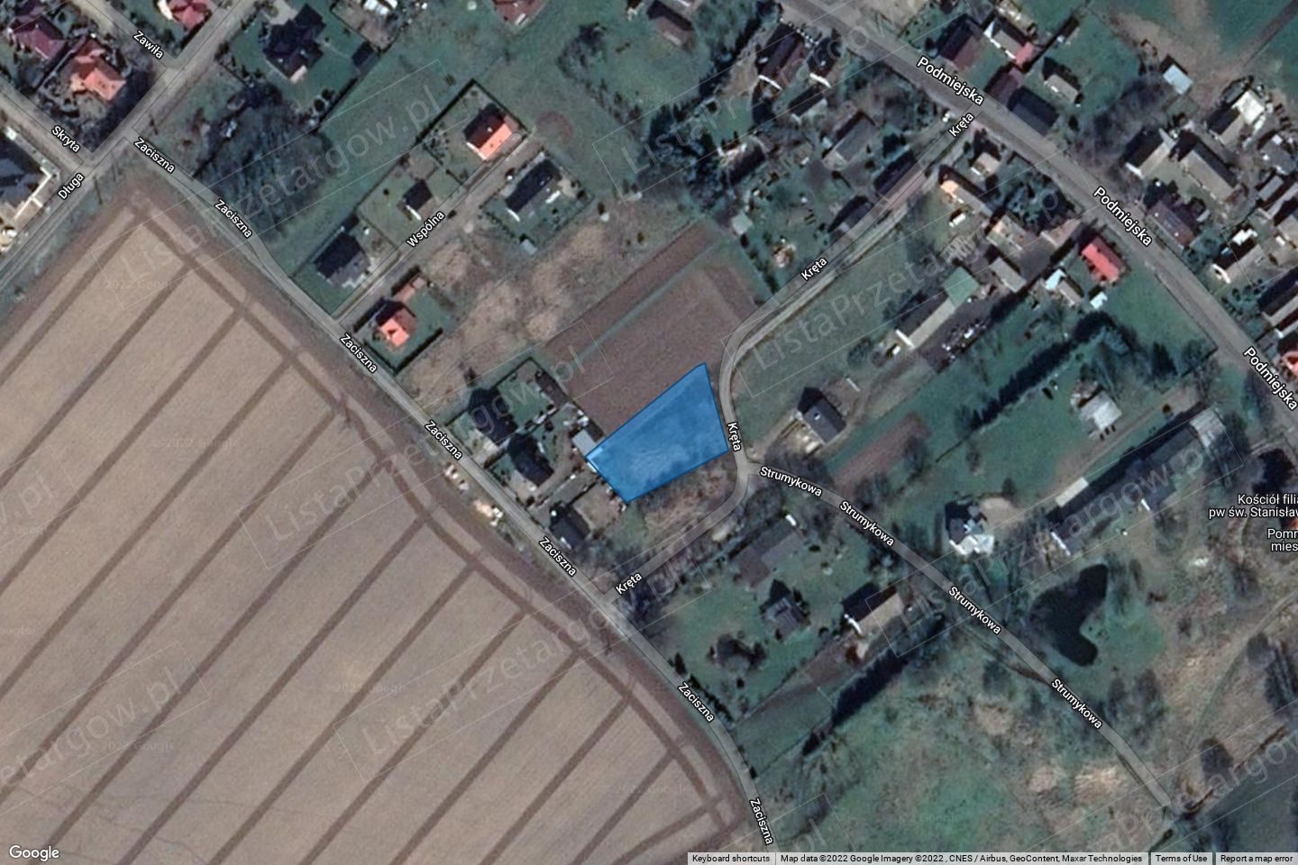 z urządzeniami towarzyszącymi obiektom budowalnym. Działka obecnie niezagospodarowana, o kształcie foremnym, umożliwiającym dogodne zagospodarowanie. Lokalizacja bardzo atrakcyjna. Dojazd ul. Podmiejską (nawierzchnia asfaltowa), następnie ul. Krętą na krótkim odcinku (płyty „Jumbo”). Uzbrojenie w sieć: wodna, sanitarna, elektryczna i gazowa, znajdują się w drodze przy granicy działki. Nad narożnikiem działki (niewielka powierzchnia) przebiega linia energetyczna.
