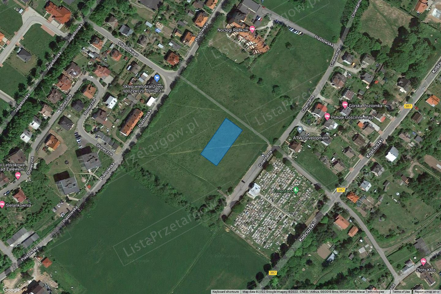 Działka jest niezabudowana, zlokalizowana w pośredniej strefie miasta. Działka posiada kształt regularny zbliżony do prostokąta, nie jest ogrodzona. Działka położona jest w terenie płaskim, porośnięta jest trawą. Działka nie jest uzbrojona. Sąsiedztwo działki stanowią tereny zabudowy mieszkaniowej jedno i wielorodzinnej oraz tereny niezabudowane przeznaczone pod zabudowę. Dostęp do działki odbywa się od ulic Piastowskiej lub Cmentarnej poprzez gminną działkę 322/22.
