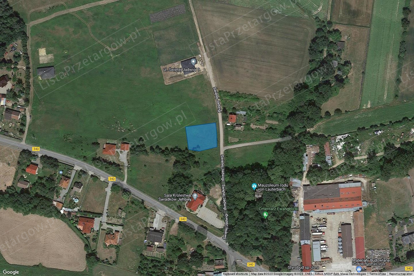 Działka jest nieuzbrojona, nieogrodzona, porośnięta, w formie pięcioboku nieforemnego, front działki od ulicy Świętej Jadwigi (droga publiczna) szerokość frontu od strony zachodniej ok. 31 m, boki działki: północny ok.40 m, wschodni ok. 29 m, od południa bok działki w kształcie rozwartej litery V o szerokości łącznej ok. 37 m (pomiary działki dokonane w Systemie Informacji Przestrzennej są wymiarami orientacyjnymi);