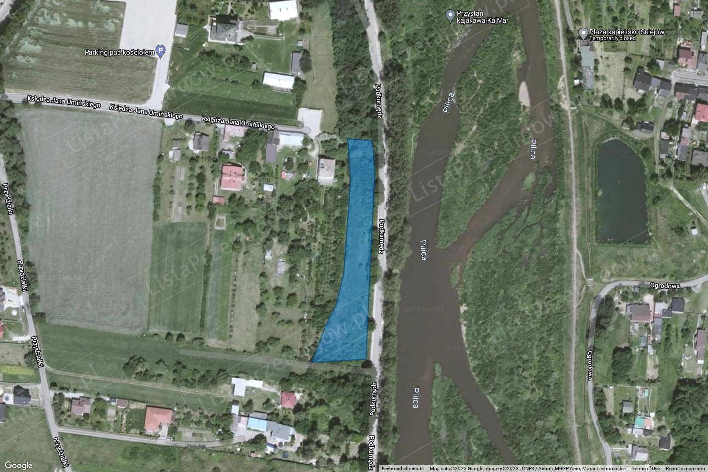 Działka graniczy z drogą powiatową ul. Podkurnędz w Sulejowie. Przeznaczenie w planie zagospodarowania przestrzennego - z dniem 1 stycznia 2004 roku zgodnie z zapisami ustawy o planowaniu i zagospodarowaniu przestrzennym, miejscowy plan zagospodarowania przestrzennego dla przedmiotowej nieruchomości przestał obowiązywać. Dla terenu ww. nieruchomości wydana została decyzja z dnia 12 stycznia 2023r. znak: PP.6730.51.2022 odmawiająca Gminie Sulejów ustalenia warunków zabudowy na inwestycję obejmującą budowę budynku mieszkalnego jednorodzinnego wraz z niezbędną infrastrukturą techniczną.