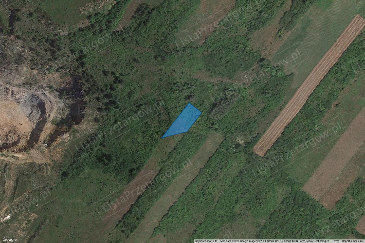 Nieruchomość jest niezabudowana, nieogrodzona. Porośnięta krzewami i drzewami. Według ewidencji gruntów nieruchomość została sklasyfikowana, jako grunty orne klasy IVb. Kształt w obrysie przestrzennym przypominający trapez prostokątny. Otoczenie nieruchomości stanowią grunty niezabudowane, rolne oraz kopalnia odkrywkowa. Brak dostępu do drogi.