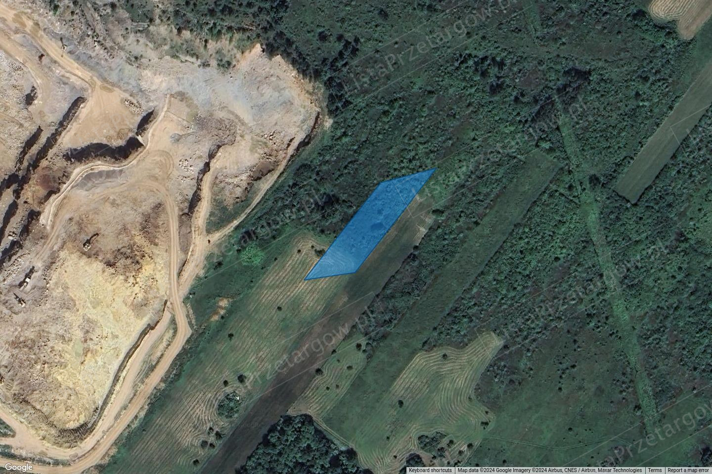 Nieruchomość jest niezabudowana, nieogrodzona. Porośnięta krzewami i drzewami. Według ewidencji gruntów nieruchomość została sklasyfikowana, jako grunty orne klasy IVb i V oraz pastwiska trwałe klasy VI. Kształt w obrysie przestrzennym przypominający wydłużony równoległobok. Otoczenie nieruchomości stanowią grunty niezabudowane, rolne oraz kopalnia odkrywkowa. Brak dostępu do drogi.