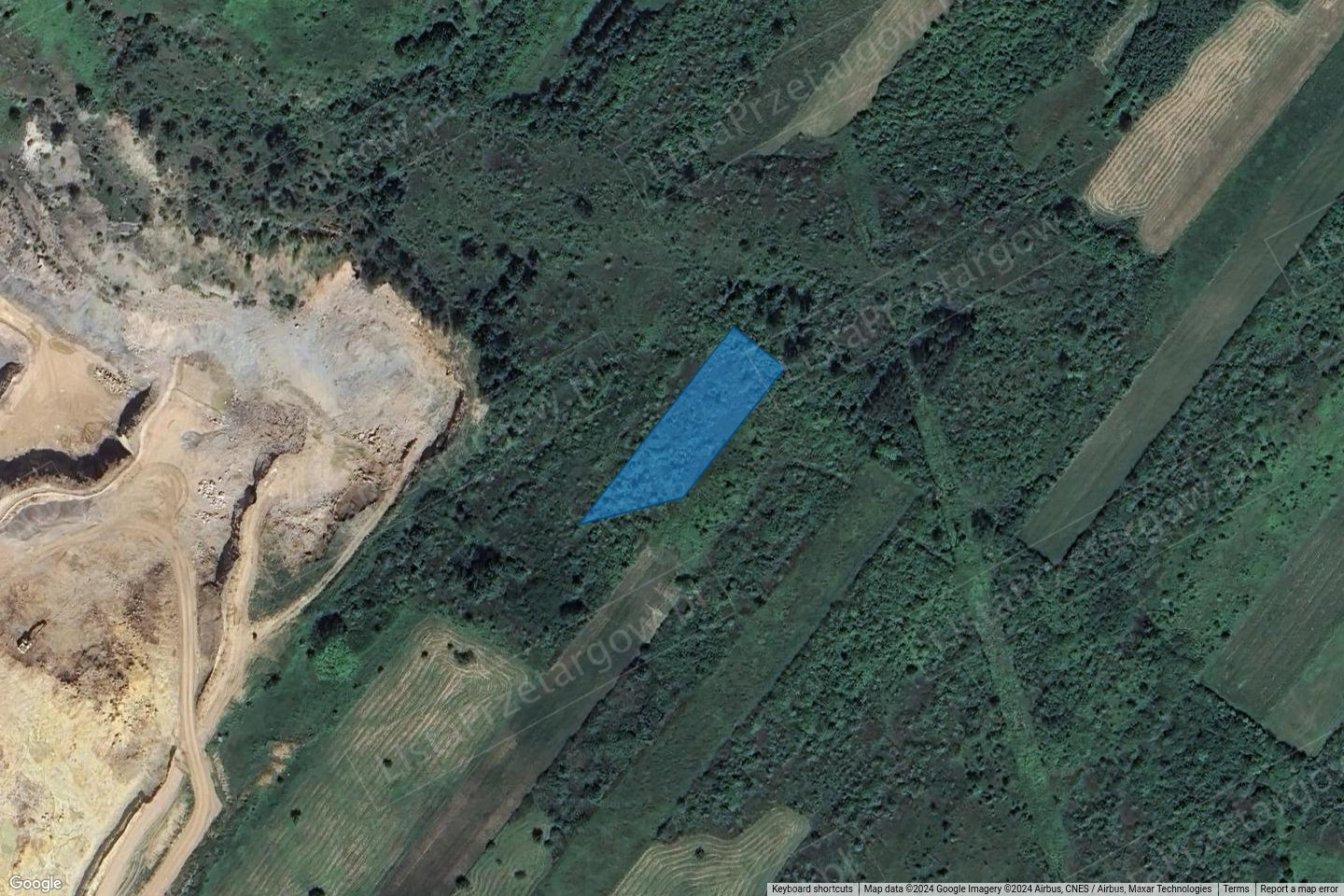Nieruchomość jest niezabudowana, nieogrodzona. Porośnięta krzewami i drzewami. Według ewidencji gruntów nieruchomość została sklasyfikowana, jako grunty orne klasy IVb. Kształt w obrysie przestrzennym przypominający wydłużony trapez prostokątny. Otoczenie nieruchomości stanowią grunty niezabudowane, rolne, oraz kopalnia odkrywkowa. Brak dostępu do drogi.