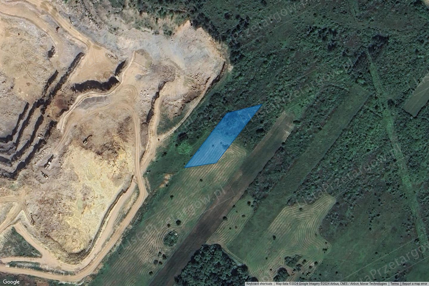 Nieruchomość jest niezabudowana, nieogrodzona. Porośnięta krzewami i drzewami. Według ewidencji gruntów nieruchomość została sklasyfikowana, jako pastwiska trwałe klasy VI, grunty orne klasy IVb i V. Kształt w obrysie przestrzennym przypominający wydłużony równoległobok. Otoczenie nieruchomości stanowią grunty niezabudowane, rolne oraz kopalnia odkrywkowa. Brak dostępu do drogi.