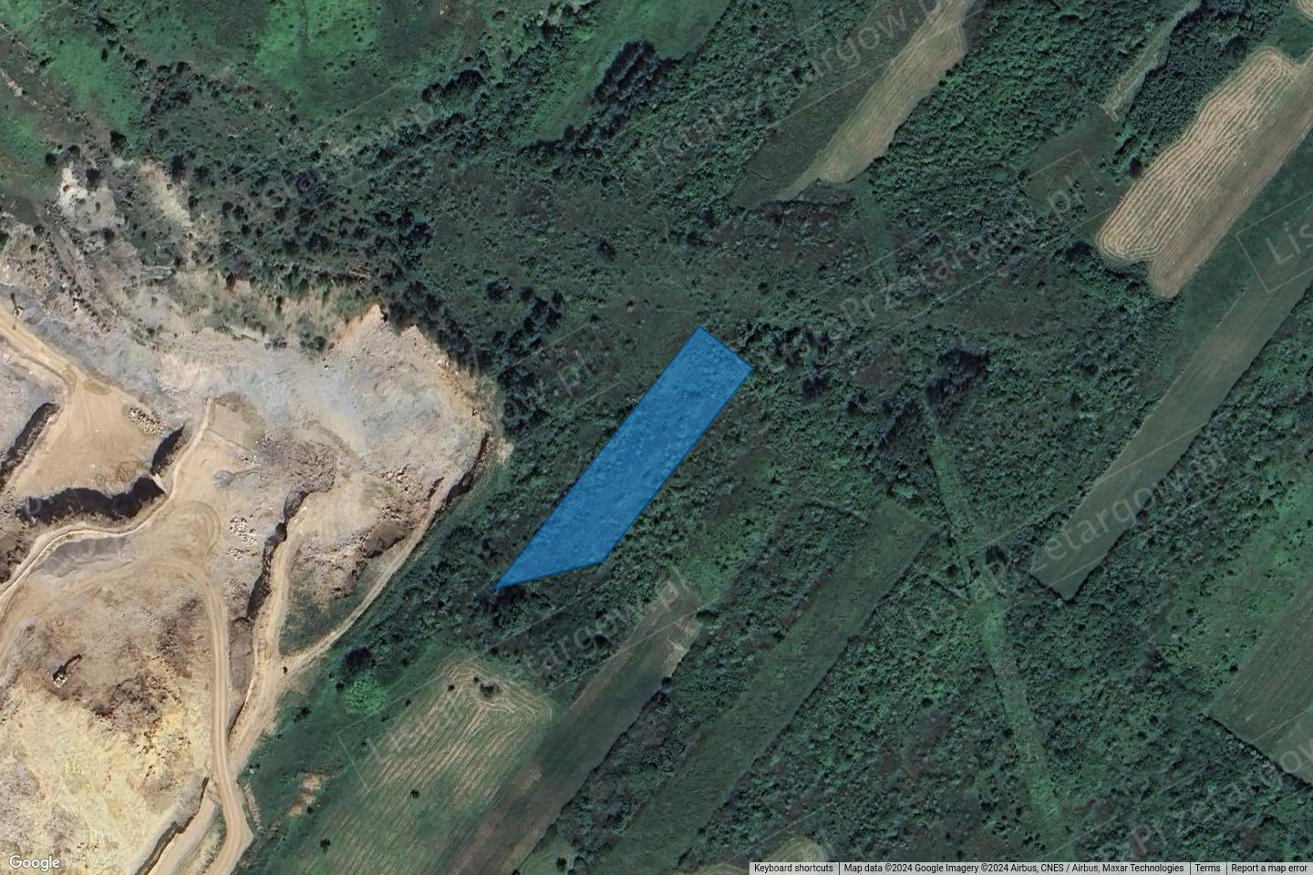 Nieruchomość jest niezabudowana, nieogrodzona. Porośnięta krzewami i drzewami. Według ewidencji gruntów nieruchomość została sklasyfikowana, jako pastwiska trwałe klasy VI. Kształt w obrysie przestrzennym przypominający wydłużony trapez prostokątny. Otoczenie nieruchomości stanowią grunty niezabudowane, rolne oraz kopalnia odkrywkowa. Brak dostępu do drogi.