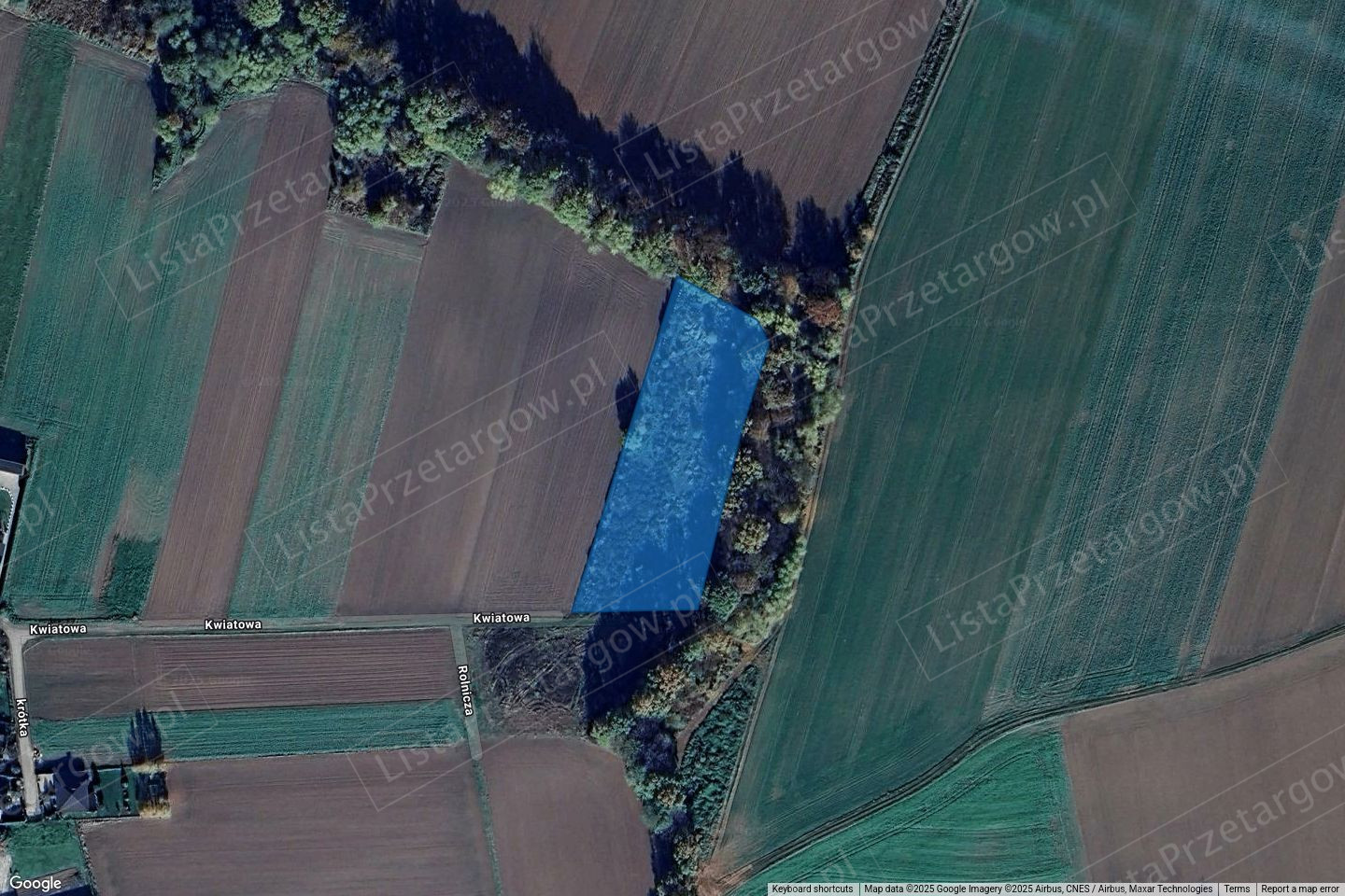 Udział wynoszący 1/2 w prawie własności nieruchomości gruntowej niezabudowanej w postaci działki ew. nr 432 o pow. 0,5825 ha, obręb nr 0017 Wierzbna, AM-1, wieś Wierzbna, gmina wiejska Żarów, powiat świdnicki, woj. dolnośląskie. Działka położona jest w pośredniej części obrębu Wierzbna. Kształt działki regularny – zbliżony do uciętego do trapezu. Teren działki niemal płaski, w dniu wizji porośnięty roślinnością trawiastą. Działka jest niezabudowana. W sąsiedztwie nieruchomości znajdują się działki o takim samy przeznaczeniu, a ponadto tereny leśne, od północy i wschodu rów oraz drzewa. Działka częściowo jest wygrodzona z przestrzeni siatką stalową. Nieruchomość posiada bezpośredni dostęp do drogi publicznej. Dojazd odbywa się od strony południowej - dz. nr ew. 690 (ul. Kwiatową) drogą gruntową, należącą do Gminy. Działka znajduje się około 100 metrów od zabudowań usytuowanych we wsi Wierzbna. Media w odległości około: woda -230 m, kanalizacja -95 m, en. elektryczna -220 m, od zachodu. W dniu wizji działka nieuzbrojona w sieci infrastruktury technicznej. Dla przedmiotowej nieruchomości gmina Żarów posiada obowiązujący mpzp, zatwierdzony Uchwałą Nr XXV/188/2012 Rady Miejskiej w Żarowie z dnia 20 czerwca 2012 r. w sprawie: miejscowego planu zagospodarowania przestrzennego obszaru położonego w obrębie wsi Wierzbna, gmina Żarów. Ponadto Uchwała Nr XXXIX/239/2005 Rady Miejskiej w Żarowie z dnia 30 czerwca 2005 r. w sprawie: miejscowego planu zagospodarowania przestrzennego dla obszaru położonego w obrębie wsi Wierzbna, gmina Żarów. Według w/w opracowań wynika, iż przedmiotowa nieruchomość położona jest na terenie oznaczonym symbolami od południa: MN – teren zabudowy mieszkaniowej jednorodzinnej (ok. 0,36 ha), 12 R – tereny rolniczej przestrzeni produkcyjnej od północy (ok. 0,2225 ha).