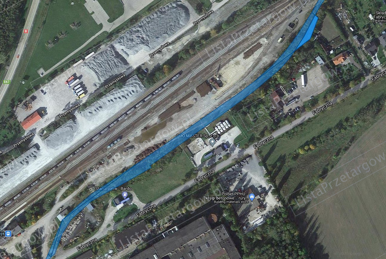 Nieruchomość zlokalizowana jest w pośredniej strefie miejscowości Bardo przy ulicy Fabrycznej nr 31, na którą składa się działka gruntu nr: 535/5 o powierzchni 0.3408 ha KW numer XXXX/XXXXXXXX/X, nr 535/4 o powierzchni 0,2970 ha KW numer XXXX/XXXXXXXX/X, nr 535/1, 535/2 o powierzchni 0,3689 ha KW numer XXXX/XXXXXXXX/X, nr 252/3, 252/4, 252/5, 252/6, 252/7 o powierzchni 0,1317 ha KW numer XXXX/XXXXXXXX/X. Działka nr 535/5 zabudowana jest budynkiem biurowym i budowlami oraz urządzeniami bazy paliw. Działka, na której zlokalizowane są budowle i urządzenia bazy jest zagospodarowana i ogrodzona w części płotem z siatki na słupkach stalowych, w części w ramach z kształtowników stalowych, od strony frontowej dwie bramy przesuwne z furtką. Działka numer 535/4 o pow.0.2970 ha jest działką niezabudowaną sklasyfikowaną jako Tr – tereny różne. Działki numer 535/1, 535/2 zabudowane są torami bocznicy kolejowej.