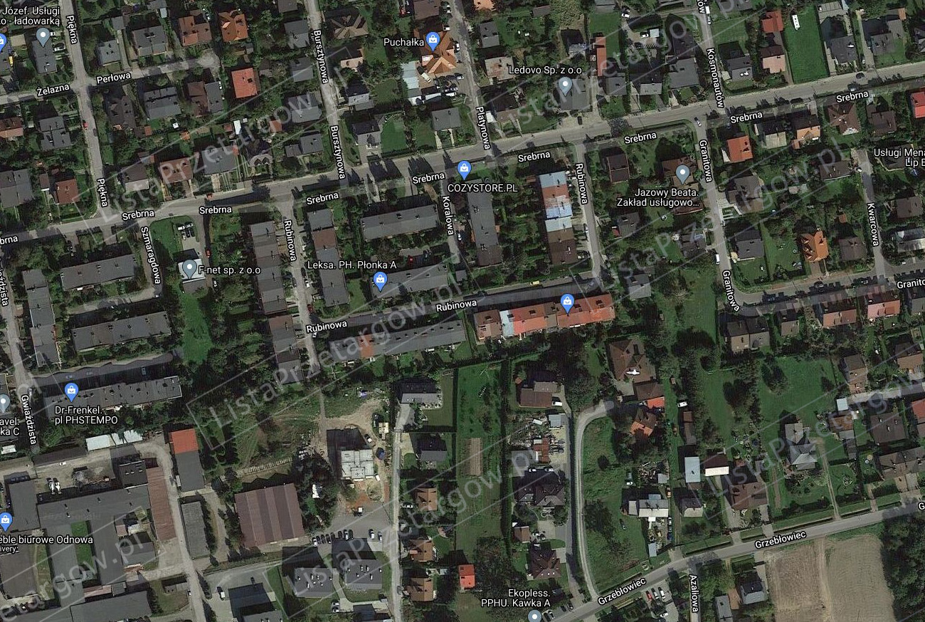 3.Nieruchomość położona jest w Pszczyna przy zbiegu ulic Srebrnej i Rubinowej. Nieruchomość stanowi teren płaski, równy, porośnięty roślinnością niską (trawą i krzewami). Kształt działki zbliżony jest do trójkąta. W sąsiedztwie nieruchomości znajduje się zabudowa mieszkaniowa jednorodzinna oraz zabudowa szeregowa. Od strony zachodniej działka przylega do gminnej drogi publicznej – ul. Rubinowej o utwardzonej nawierzchni.