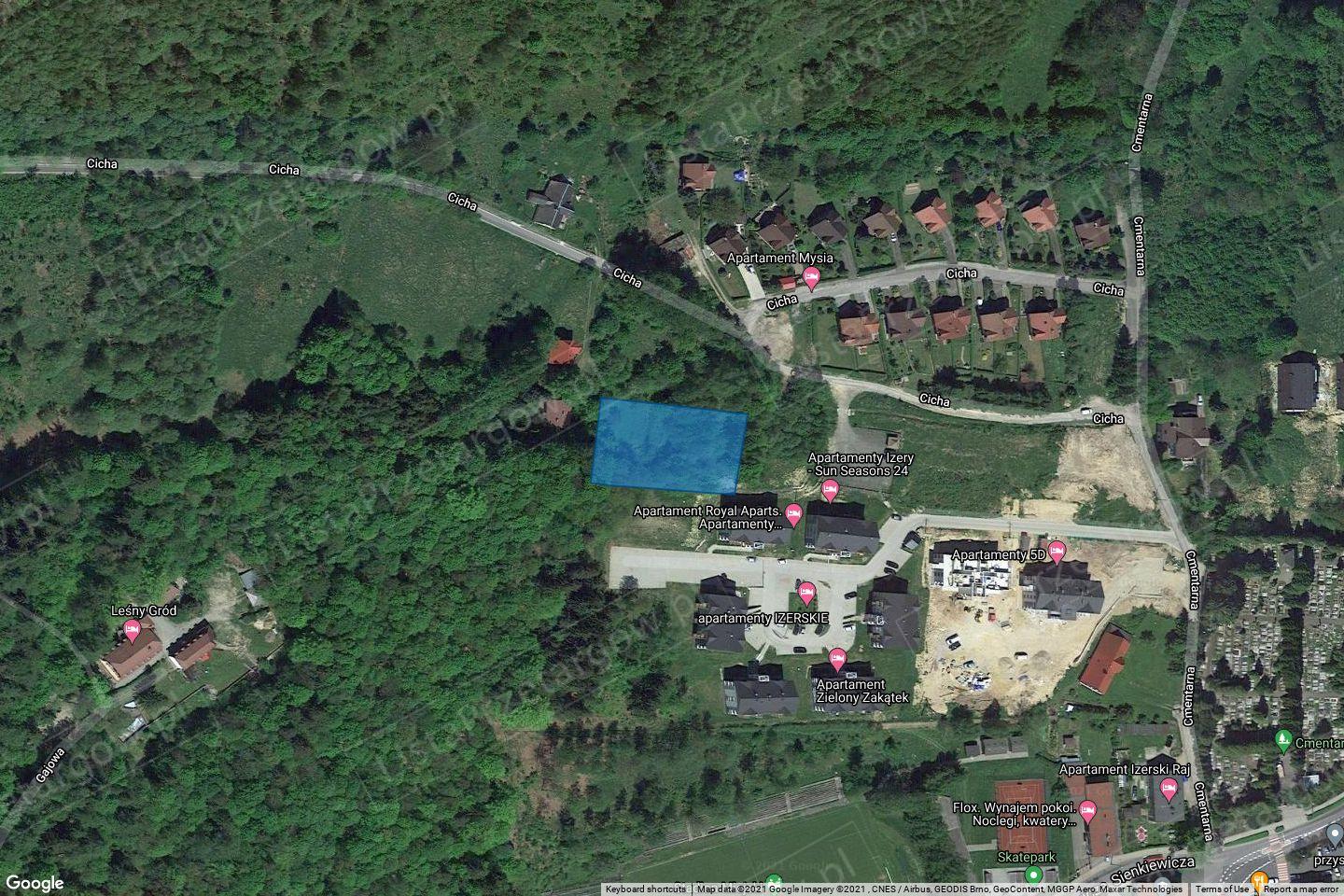 Nieruchomość gruntowa położona w Świeradowie - Zdrój, gm. Świeradów - Zdrój, działka ewidencyjna nr 74/3 o powierzchni 0,2000ha .W bezpośrednim sąsiedztwie nieruchomości znajduje się rozproszona zabudowa mieszkaniowa jednorodzinna oraz nowa zabudowa wielorodzinna apartamentowa i tereny niezabudowane. Dojazd do nieruchomości drogą asfaltową, a w końcowym odcinku drogą gruntową utwardzoną. Nieruchomość nie posiada dostępu do drogi publicznej. Ze wszystkich stron przylega do innych działek zabudowanych oraz niezabudowanych zalesionych, stanowiących własność osób trzecich oraz Nadleśnictwa Świeradów-Zdrój. Działka nr 74/3 ma kształt regularny, prostokątny. Ukształtowanie terenu ze spadkiem w kierunku wschodnim. Działka jest niezabudowana i nieogrodzona, w znacznym stopniu zadrzewiona i zakrzaczona. Zgodnie z mapą zasadniczą działka nie jest uzbrojona, ale na sąsiednich nieruchomościach dostępne są: energia elektryczna, wodociągi i kanalizacja, a przy nieruchomościach położonych niżej ul. Cichej także sieć gazowa. Zgodnie z Uchwałą Rady Miasta Świeradów-Zdrój nr IX/50/2019 z dnia 25 kwietnia 2019r. w sprawie uchwalenia miejscowego planu zagospodarowania przestrzennego miasta Świeradów-Zdrój (Dz. Urz. Woj. Doln. z dnia 23 maja 2019r., poz. 3399), nieruchomość położona jest na terenie oznaczonym symbolem planu 67MN/UT: 1) przeznaczenie podstawowe: zabudowa mieszkaniowa jednorodzinna lub usług turystyki i wypoczynku; 2) przeznaczenie dopuszczalne: a) usługi handlu detalicznego, gastronomii, b) budynki gospodarcze,c) budynki garażowe, d) budynki gospodarczo-garażowe; Działka położona jest także w granicach strefy B ochrony uzdrowiskowej „Świeradów-Zdrój” i „Czerniawa-Zdrój” oraz w granicach strefy obserwacji archeologicznej miasta Świeradów-Zdrój i obszarze objętym ochroną konserwatorską, z uwagi na wpisanie miasta Świeradów-Zdrój do rejestru zabytków. Nieruchomość stanowi własność dłużników: xx