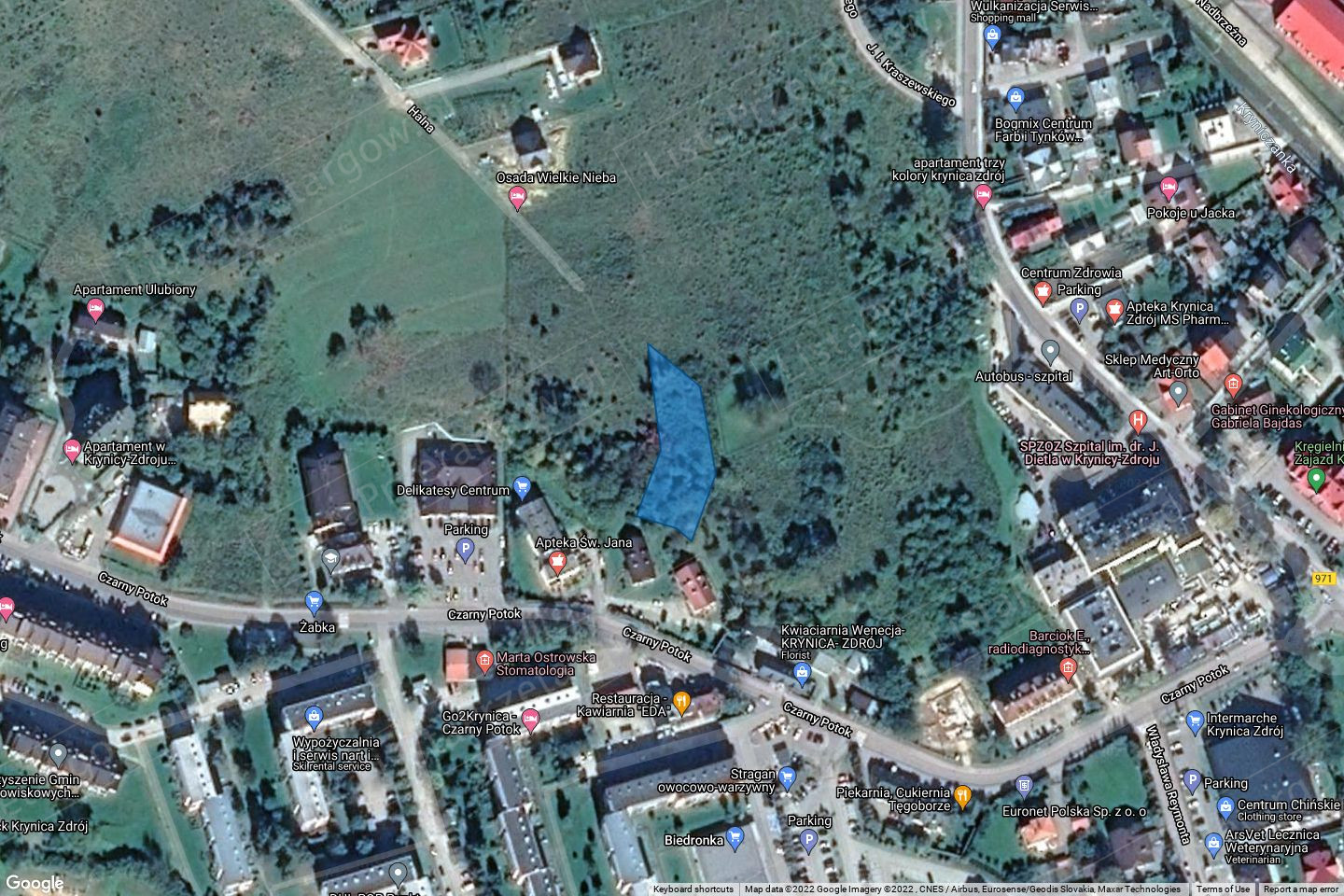 Działki ewidencyjne zlokalizowane są niedaleko zbiegu ulic Czarny Potok i Kraszewskiego, która stanowi drogę wojewódzką nr 971. Działki znajdują się na stoku o nachyleniu wschodnim lub południowym, w odległości ok. 2 km od centrum Krynicy-Zdroju i ok 2,5 km od terenów sportowych i rekreacyjnych (Kolej Gondolowa Jaworzyna Krynicka). Dojazd do nieurządzonej drogi wewnętrznej (dz. 403/38) stanowi ulica Halna, łącząca się z ulicą Kraszewskiego. Działki są niezabudowane, stanowią teren zielony częściowo zakrzaczony, z pojedyczymi drzewami. Sąsiedztwo działek stanowi zabudowa mieszkaniowa jednorodzinna oraz tereny zielone. Niedaleko znajduje się szpital, budynki handlowo – usługowe i osiedle mieszkaniowe. Z urządzeń infrastruktury technicznej działki posiadają dostęp do sieci: energetycznej, wodociągowej, kanalizacyjnej i gazowej od strony ulicy Halnej lub Czarny Potok.