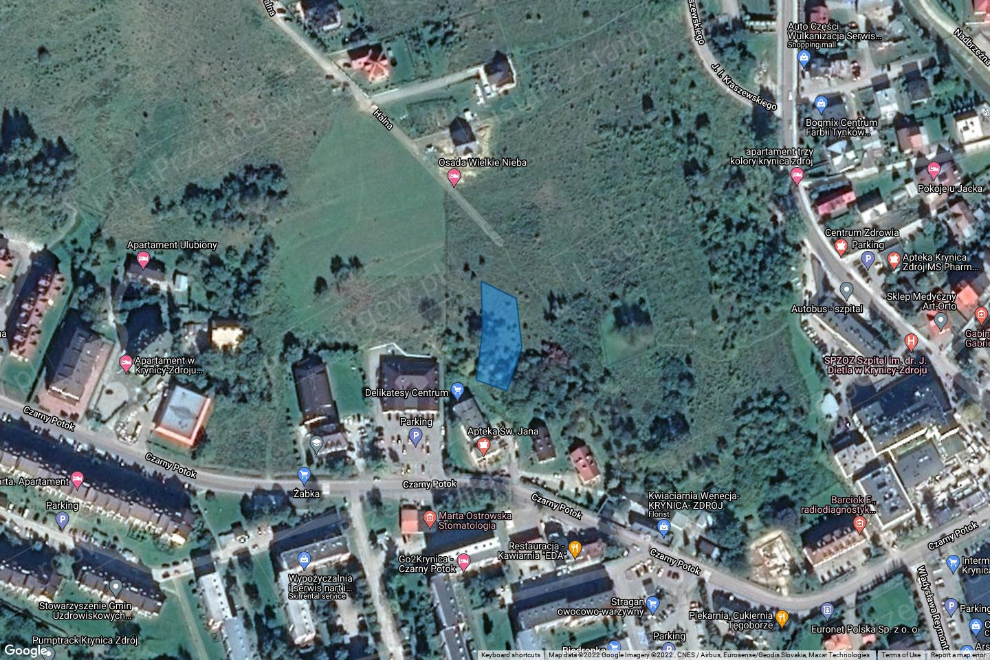 Działki ewidencyjne zlokalizowane są niedaleko zbiegu ulic Czarny Potok i Kraszewskiego, która stanowi drogę wojewódzką nr 971. Działki znajdują się na stoku o nachyleniu wschodnim lub południowym, w odległości ok. 2 km od centrum Krynicy-Zdroju i ok 2,5 km od terenów sportowych i rekreacyjnych (Kolej Gondolowa Jaworzyna Krynicka). Dojazd do nieurządzonej drogi wewnętrznej (dz. 403/38) stanowi ulica Halna, łącząca się z ulicą Kraszewskiego. Działki są niezabudowane, stanowią teren zielony częściowo zakrzaczony, z pojedyczymi drzewami. Sąsiedztwo działek stanowi zabudowa mieszkaniowa jednorodzinna oraz tereny zielone. Niedaleko znajduje się szpital, budynki handlowo – usługowe i osiedle mieszkaniowe. Z urządzeń infrastruktury technicznej działki posiadają dostęp do sieci: energetycznej, wodociągowej, kanalizacyjnej i gazowej od strony ulicy Halnej lub Czarny Potok.