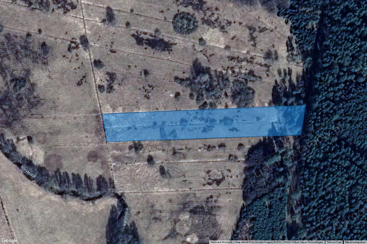 Korytnica, przy drodze gruntowej niskiej jakości. W sąsiedztwie nieruchomości rolne i leśne, działka graniczy z