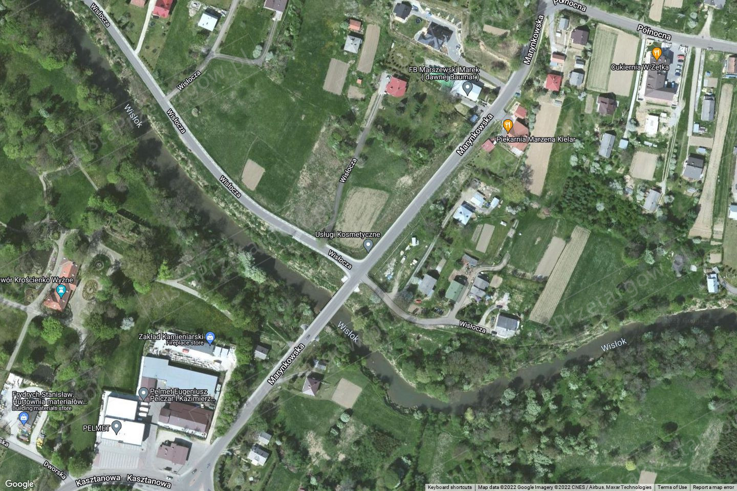 Część nieruchomości gruntowej niezabudowanej położona w Krościenku Wyżnym oznaczona w ewidencji gruntów identyfikatorem działki 180706_2.0001.1608/2 położona jest w około - środkowej części gminy i obrębu Krościenko Wyżne, w odległości liniowej około 1 km od centrum obrębu. Sąsiedztwo i otoczenie działki stanowią tereny niezabudowane, rolne. Najbliższa zabudowa mieszkalna zlokalizowana jest w odległości około 130 m od działki od strony południowej oraz w odległości około 100 m od strony zachodniej działki.