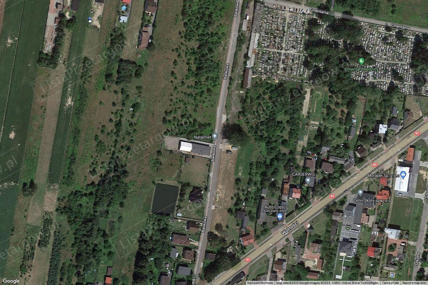 2. Opis i przeznaczenie nieruchomości: działka gruntowa niezabudowana, nieogrodzona, teren stosunkowo płaski, porośnięty dziko rosnącą roślinnością trawiastą. Nieruchomość położona bezpośrednio przy ul. Bankowej - brak urządzonego zjazdu, działkę od drogi rozgranicza rów przydrożny. W ciągu ul. Bankowej znajduje się infrastruktura techniczna tj. sieci: elektroenergetyczna, gazowa, wodociągowa i kanalizacyjna. Przez teren działki, w jej południowo-wschodnim narożu, przebiega napowietrzna sieć energii elektrycznej.
