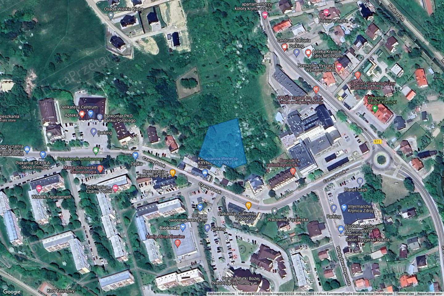 Działka ewidencyjna zlokalizowana jest niedaleko zbiegu ulic Czarny Potok i Kraszewskiego, która stanowi drogę wojewódzką nr 971. Działka znajduje się na stoku o wystawie wschodniej, w odległości ok. 2 km od centrum Krynicy-Zdroju i ok 2,5 km od terenów sportowych i rekreacyjnych (Kolej Gondolowa Jaworzyna Krynicka). Dojazd do działek stanowi ulica Halna, łącząca się z ulicą Kraszewskiego. Działka niezabudowana, stanowiąca teren zielony częściowo zakrzaczony. Sąsiedztwo działki stanowi zabudowa mieszkaniowa jednorodzinna oraz tereny zielone. Niedaleko znajduje się szpital, budynki handlowo – usługowe i osiedle mieszkaniowe. Infrastruktura techniczna (energia elektryczna, gaz, wodociąg, kanalizacja) znajduje się na działkach sąsiednich od strony ul. Halnej. Warunki podłączenia do sieci należy uzgodnić z dostawcami mediów.