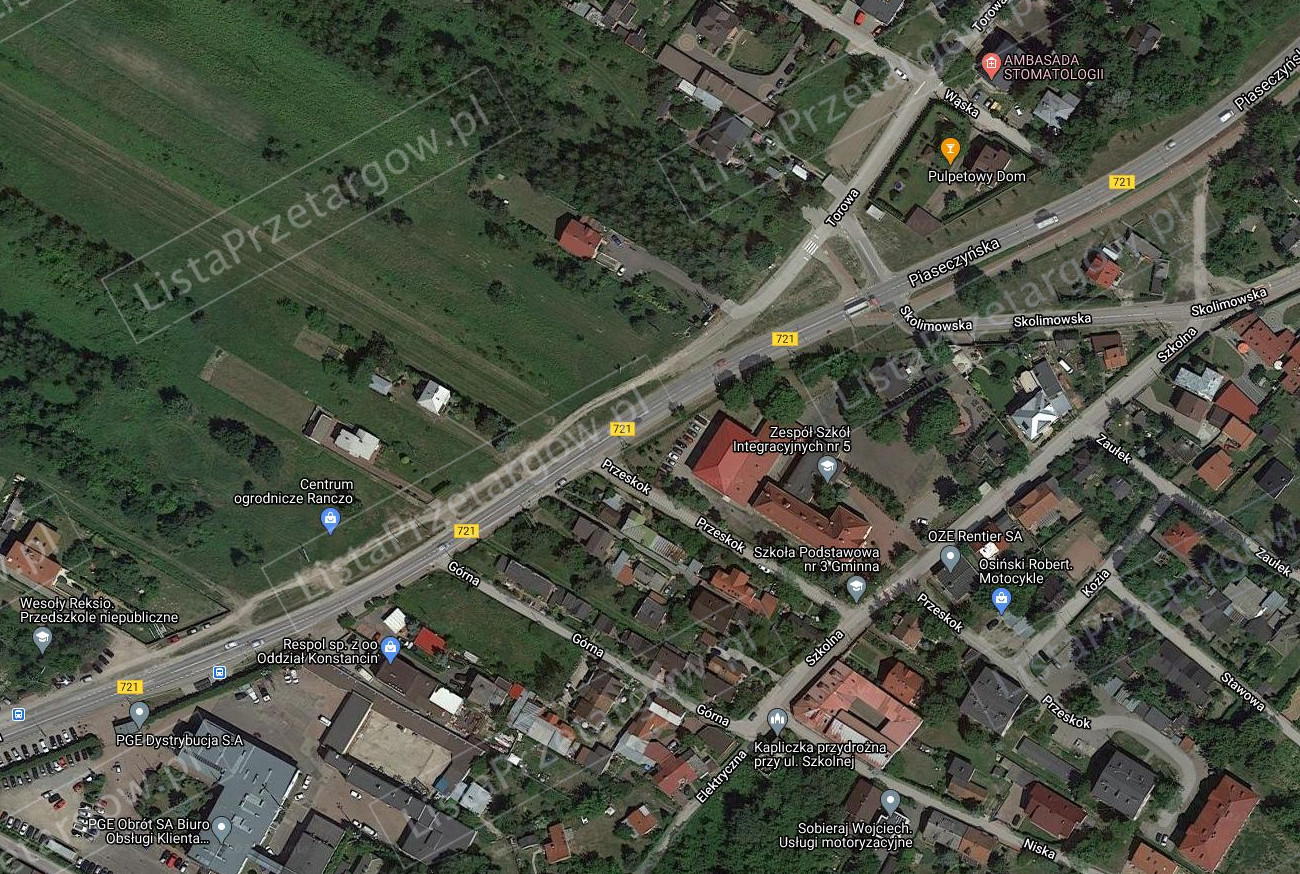 Opis nieruchomości: Nieruchomość położona jest przy ul. Piaseczyńskiej w Konstancinie-Jeziornie, która stanowi drogę wojewódzką nr 721. W sąsiedztwie znajduje się zabudowa mieszkaniowa jednorodzinna i usługowo-handlowa. W odległości 600 m znajduje się siedziba Urzędu Miasta i Gminy Konstancin-Jeziora. Działka ma ksztalt nieregularny, jest przedzielona ogrodzeniem stalowym na fundamencie. Część znajdująca się przy ul. Piaseczyńskiej jest utwardzona kostka betonową o powierzchni około 165 m2 i stanowi parking oraz dojazd do zakładu energetycznego. Pozostała część jest użytkowana przez zakład energetyczny.
